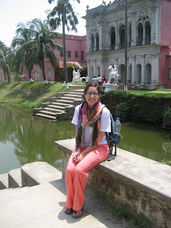 Today, I went to Sonargaon, the first capital of Bangladesh. The scenery was beautiful, although it felt like it was 120 degrees with 100% humidity, so it was hard to appreciate our surroundings. There was a sweet fort/museum, and they were celebrating an arts festival, so there were lots of locals there. They were a typical Bangladeshi crowd, and as such, we were treated like celebrities. One man came up to me and said, “one picture please?” and then I heard him take approximately 12 pictures. Other people don’t ask to take a picture, they just whip out their camera phones and catch you off guard. Also, there were lots of school children who came up to us and presented us with flowers, after spouting off the only English sentence that they knew (“Hello, how are you, fine thank you, goodbye”… all in one breath). I met a very nice professor and his family, and he requested my e-mail address, so I am looking forward to receiving special e-mails from them. One of the girls that I was with got asked for her autograph. Also, today was the first time that I have seen another group of tourists out and about in Bangladesh. After Sonargaon, we went to see a famous fort in old Dhaka. It was built in the 1600’s, and it is supposedly haunted because the daughter of the Kahn died before the fort was finished. It started raining, so we unfortunately did not get to take a rickshaw tour through old Dhaka, or the much anticipated boat ride through parts of Dhaka. Next time…